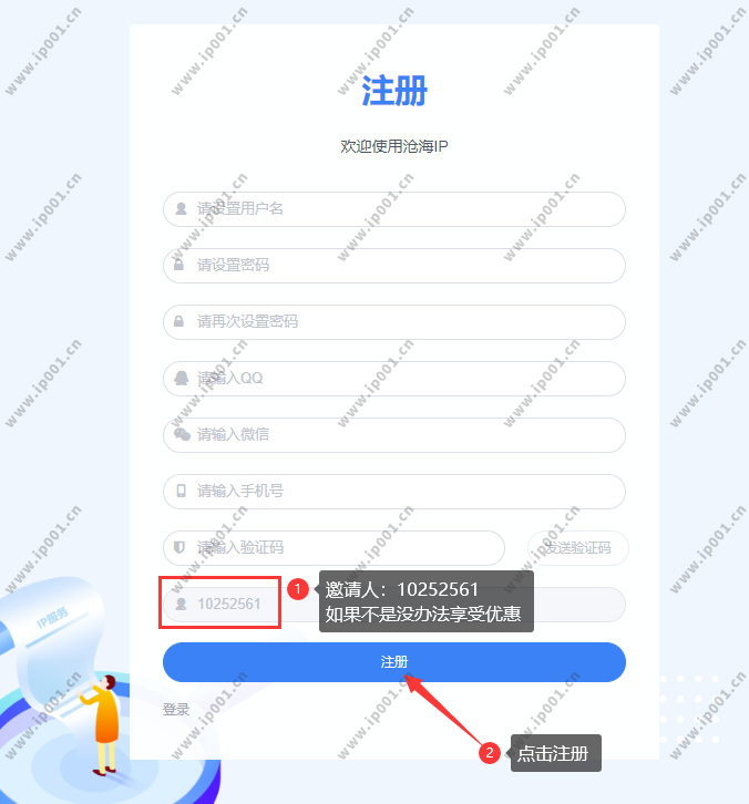 根据要求设置用户名、密码、QQ号、微信号、手机号、验证码、邀请码 10252561 点击注册。