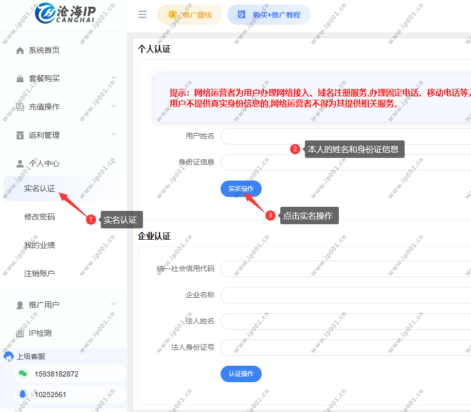账号注册成功后会提示您登录,输入刚注册的账号密码点击登录,点击个人中心→实名认证,根据要求完成实名操作。 ⚠️ 重要提示:不完成实名认证无法购买任何节点产品