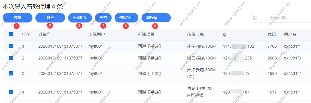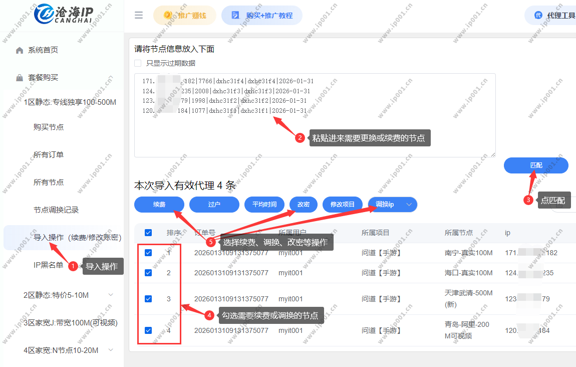 找到已购套餐 → 点击导入操作 → 粘贴节点信息 → 点击匹配 → 勾选目标节点 → 选择续费/调换/改密等 → 完成操作。